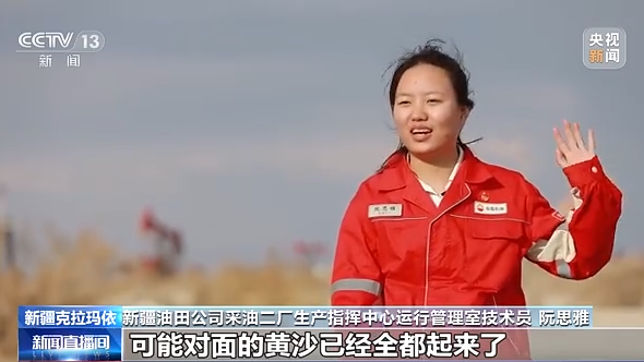 新疆油田公司采油二厂生产指挥中心运行治理室手艺员阮思雅:你听像现在这种风,在克拉玛依可能已经算是较量小的风了,有时间在五六级那种风的时间,可能扑面的黄沙已经全都起来了,已经看不到我们巡检的路了 。其时刚来就以为,我来了一个什么地方,习惯以后就以为,我们就是这么个条件,可是已经没有那么难接受了,就以为掏两下不就完事了 。