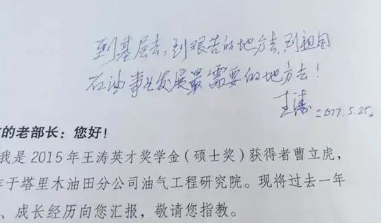 曹立虎至今保存着原石油工业部部长王涛给他的寄语:“2015年,我获得王涛英才奖学金,老部长勉励我到新疆塔里木去。事情两年后,给老部长写信汇报事情,老部长给我写了寄语到下层去,到艰辛的地方去,到祖国石油事业生长最需要的地方去