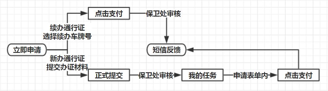 “办理营业”选择“新办通行证”,完善信息并提交办理质料,由守卫处审核后再缴费。