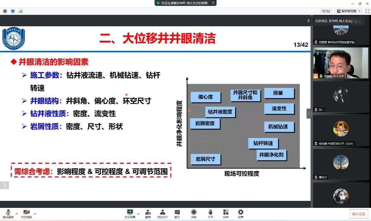 2022年11月10日,碳中和树模性能源学院周蒙蒙副教授和武晓光讲师配合约请中国地质大学(北京)许争鸣副教授,通过腾讯聚会分享了精彩的学术报告——《大位移水平井井眼井筒清洁理论及手艺》。
