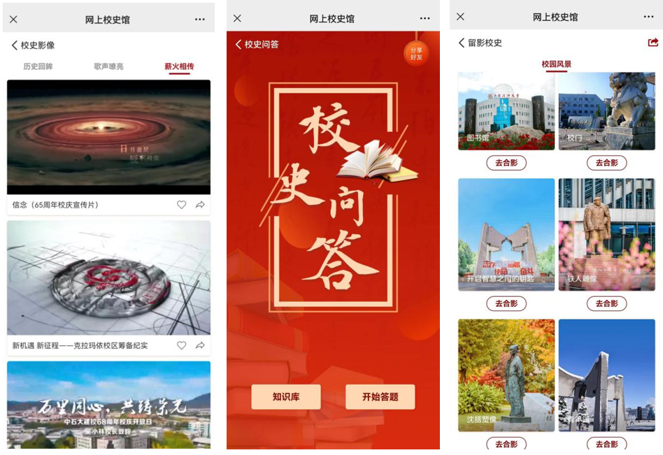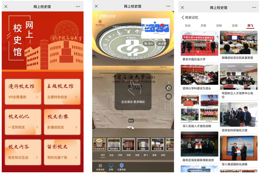 ÍøÉÏУʷ¹Ý¿çÔ½ÁËʱ¿ÕÏÞÖÆ£¬´Ó¡°ÖÜÓÎУʷ¹Ý¡±¡°Ö÷ÌâУʷ¹Ý¡±¡°Ð£Ê·Ó°Ï󡱡°Ð£Ê·Ó°Ïñ¡±¡°Ð£Ê·Îʴ𡱡°ÁôӰУʷ¡±Áù¸ö°æ¿é¶ÔУʷ°ÚÉè¹ÝµÄ¹Ý²ØÄÚÈݾÙÐÐչʾ¡£¡°ÖÜÓÎУʷ¹Ý¡±¡°Ö÷ÌâУʷ¹Ý¡±»®·Ö´ÓÕ¹ÌüÈ«¾°¡¢Õ¹Ìüϸ½ÚÍêÕû·ºÆðÁËʵÌåУʷ¹Ý¡°´´ÒµÌü¡±¡°ÇóË÷Ìü¡±¡°ÃÖÐÂÌü¡±¡°Éú³¤Ìü¡±¡°ÌÚ·ÉÌü¡±ÒÔ¼°ÐòÌüºÍβÌüµÄÄÚÈÝ£¬Í¨¹ýÈ«¾°Ó°ÏñÊÖÒÕµ¼ÀÀϵͳ£¬ÊµÏÖÁËÐéÄâÈËÎïÖÜÓÎͬУʷͼƬ¡¢Õ¹³ÂÎÄ×Ö¡¢ÖÇÄÜÓïÒô½â˵¡¢ÊÓÆµÐû´«Æ¬µÈչʾÐÎʽµÄÓлúÁ¬Ïµ¡£ÂÃÐÐÕß¿ÉÒÔ×ÔÓÉÑ¡ÔñÕ¹Ìü£¬VRÄ£Ê½ËæÊ±Çл»£¬ÒÔÂþÓÎÊӽǻñµÃÉíÁÙÆä¾³µÄÂÃÐÐÌåÑé¡£¡°Ð£Ê·Ó°Ïó¡±Í¨¹ýͼÎÄÐÎʽÊáÀíÁËѧУÉú³¤ÂöÂ磬´Óºê¹Û½Ç¶ÈչʾѧУÉú³¤Àú³Ì£¬ÎªÂÃÐÐÕßÔöÌí¸»ÓÐÌØÉ«µÄУʷӰÏ󣻡°Ð£Ê·Ó°Ïñ¡±Õ¹²¥ÌåÏÖÎÒ¹úʯÓÍÐÐÒµÉú³¤ºÍѧУУʷУÇéµÄÐû´«ÊÓÆµ£¬ÒÔÉú¶¯µÄ·½·¨½²ÊöʯÓÍÀúÊ·£¬Ðû´«Ê¯ÓÍÎÄ»¯£¬ºëÑïÖпʱ¾«Éñ£»¡°Ð£Ê·Îʴ𡱷ÖΪ֪ʶ¿âºÍ´ðÌâÁ½¸öÄ£¿é£¬ÂÃÐÐÕß¿ÉÒÔÔÚ֪ʶ¿â·ÖÃűðÀàµØÕÆÎÕ×Ô¼º¸ÐÐËȤµÄУʷ֪ʶ£¬ÔÚ´ðÌâÄ£¿éÄ¥Á·Ñ§Ï°Ð§¹û£¬ÔÚ»¥¶¯ÖÐÔö½ø¶ÔУʷУÇéµÄÏàʶ£»¡°ÁôӰУʷ¡±Ñ¡È¡ÁËУ԰±ê¼ÇÐÔ¾°¹ÛͼƬ£¬ÂÃÐÐÕß¿ÉÒÔÑ¡Ôñϲ»¶µÄУ԰¾°ÎÓë×Ô¼ºµÄÈËÎïÕÕÆ¬¡°ºÏÓ°¡±£¬ÁôÏÂÓÅÃÀµÄУ԰»ØÒ䣬ʵÏÖ¡°ÔÆÁôÓ°¡±¡£