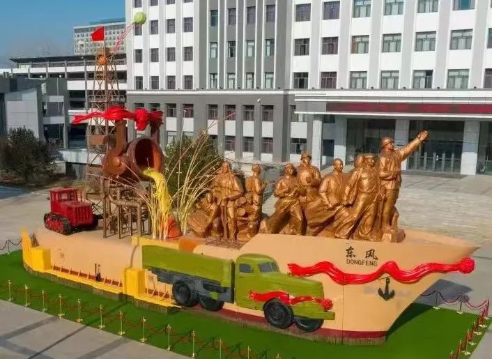 ²Ê³µ³µÍ·ÒÔÍõ½øÏ²¡¢Ê±´«ÏéµÈÀÍģȺµñΪÖ÷ÌåÐÎÏ󣬳µÌåÓÉÐÂÖйúµÚÒ»ËÒÍò¶ÖÂÖ¡¢µÚÒ»Á¾½â·Å¿¨³µ¡¢µÚÒ»Á¾¶«·½ºìÍÏí³»úºÍÓÍÌï¾®¼Ü¡¢¡°Á½µ¯Ò»ÐÇ¡±¡¢·áÊÕµ¾¹ÈµÈ×é³É£¬¸Ö»¨·É½¦¡¢ÌúË®±¼Á÷£¬Ê¯ÓÍÁ÷ÌÊ¡¢ÂóÀËÌÏÌÏ£¬ÕÃÏÔ½¨ÉèÉç»áÖ÷ÒåʱÆÚµÄ»ðÈȵĽ¨É賡¾°ºÍʱ´ú¾«Éñ¡£