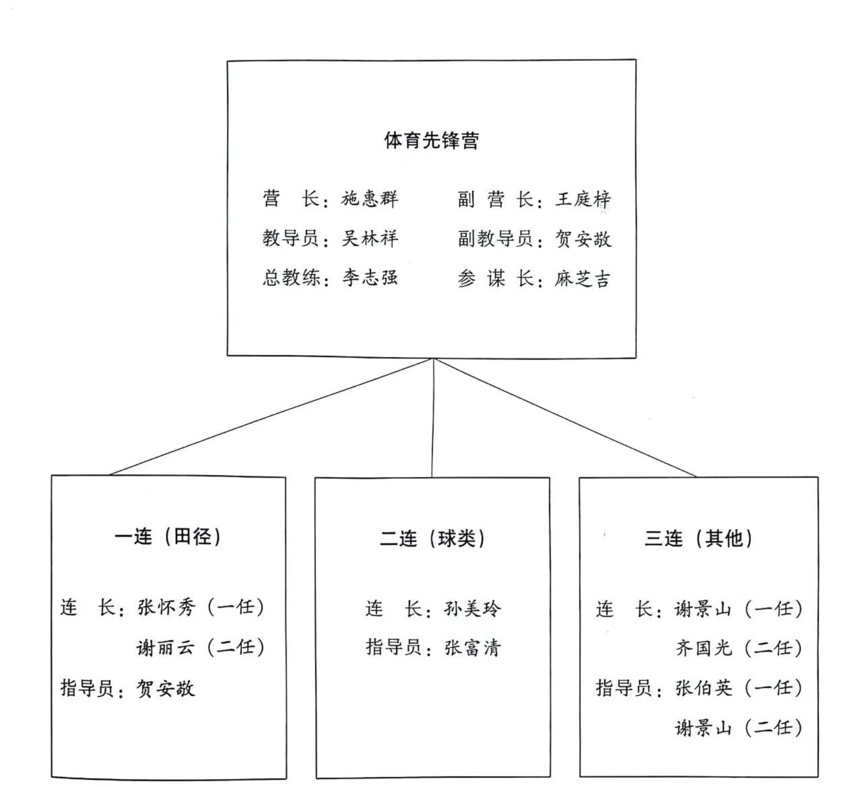 ÌåÓýÏÈ·æÓªÊµÑéͳһֱµ¼£¬¼¯ÖÐÖÎÀí£¬½¨Éèµ³ÍÅ×éÖ¯£¬Ëæ°àÉϿεķ½·¨¡£ÏÂÉèÈý¸öÁ¬£¬Ò»Á¬ÎªÌï¾¶¶Ó£¬¶þÁ¬ÎªÇòÀà¶Ó£¬ÈýÁ¬ÎªÆäËû¸÷Ïî´ú±í¶Ó¡£ÌåÓýÏÈÉúÁ¬Ïµ×Ô¼ºµÄר³¤£¬ÏìÓ¦µØµ£µ±Á˸÷´ú±í¶ÓµÄ½ÌÁ·¡£Ñ§Ð£ÈÎÃüÀî־ǿΪ×ܽÌÁ·£¬Í¬Ê±Ñ¡µ÷ÁË10Ãû¸É²¿³ä·ÖÌåÓý¸÷¼¶»ú¹¹£¬ÒÔÔöǿͷÄÔÊÂÇéºÍ×éÖ¯ÖÎÀí¡£
