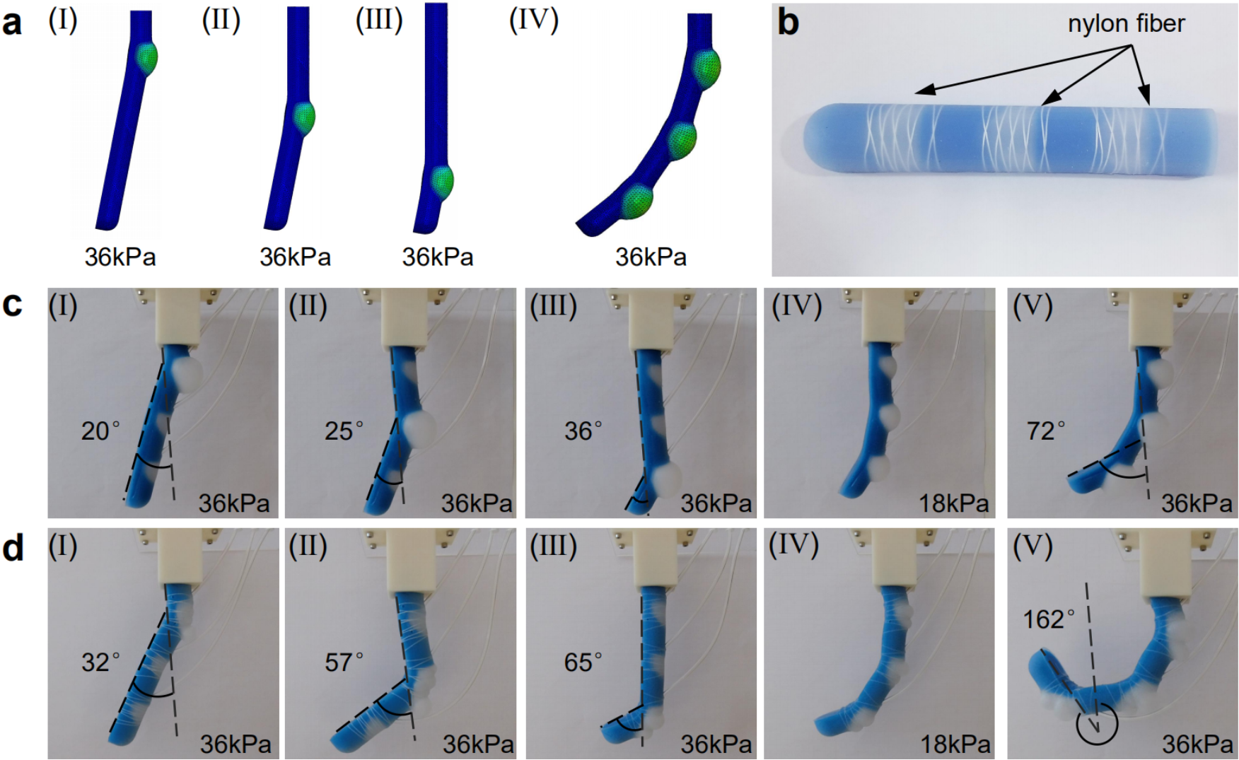 Ö´ÐÐÆ÷µÄ·ÂÕæºÍʵÑé±ÈÕÕ¡£(a)36kPaÏÂÈýǻִÐÐÆ÷µÄ·ÂÕæÕ¹ÍûЧ¹û£»(b)ÏËάÔöÇ¿µÄÈýǻִÐÐÆ÷£»(c)ÎÞÏËάÔöÇ¿µÄÈýǻִÐÐÆ÷µÄÍäÇúЧ¹û£»(d)ÏËάÔöÇ¿µÄÈýǻִÐÐÆ÷µÄÍäÇúЧ¹û.