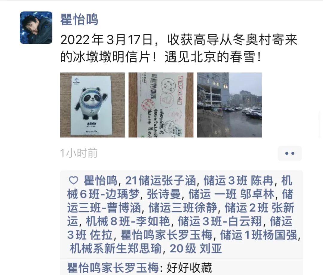 油气储运工程2021级本科生蔡文灏说,冰与春雪,雪和容融,百张明信片带着冬奥的印记,跨越山海来到我们手中。冬奥村与中凯时,冬奥自愿者和凯时学子,导员和我们,这些不但是一份记挂,更是一种缘分。冬奥已过,春雪降临,疫情无法阻遏相连的心,我们牵手相约,一起向未来!