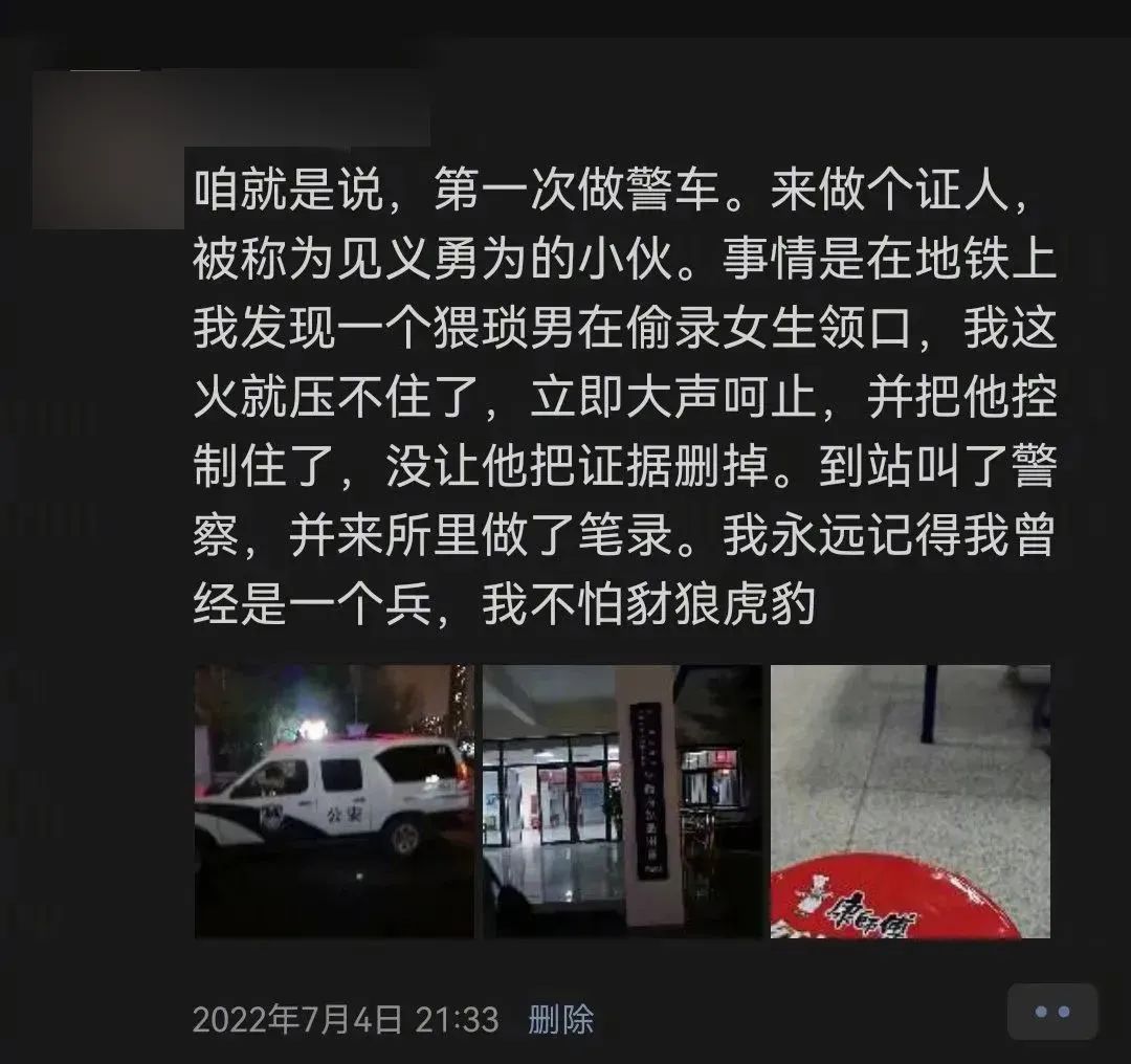 7月4日黄昏6点半左右 ,张明涵在北京8号线地铁上发明一名正在偷拍女旅客的男子 。他绝不犹豫一声呵叱 ,见男子妄想删除照片 ,张明涵赶忙拉住男子手臂 ,将存有证据的手机夺走 ,在两位盛意年迈的资助下制服了偷拍男子 。下地铁后 ,张明涵请站台事情职员报了警 ,又追随警员回到派出所 ,完成了后续嫡沂录等事情 。